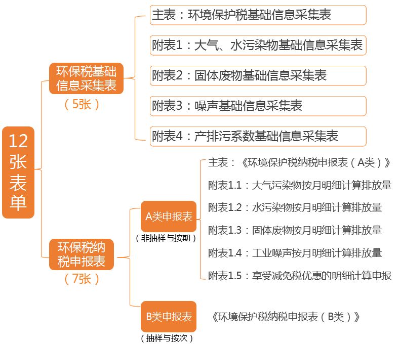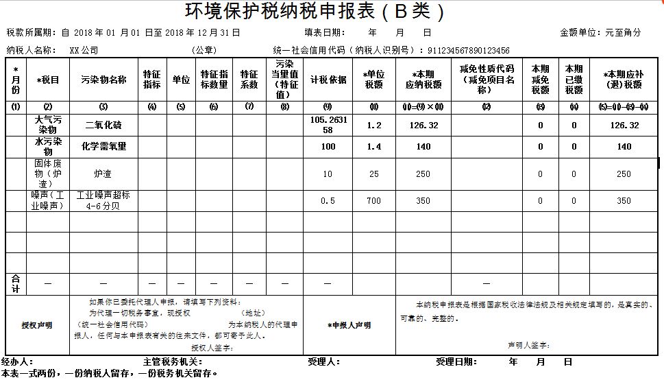 7. 环境保护税纳税申报表(B表):适用于除A类申报之外的其他纳税人,包括按次申报纳税人、适用环境保护税法所附《禽畜养殖业、小型企业和第三产业水污染物当量值》表的纳税人和采用抽样测算方法计算污染物排放量的纳税人。